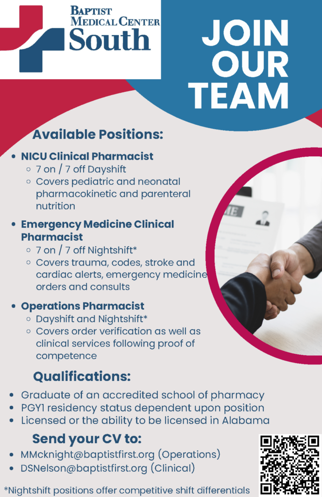 Qualifications – Pharm.D. or B.S. Degree. Residency or hospital experience (3-5 years) strongly preferred. Board Certification preferred. Must be currently licensed or eligible for licensure to practice pharmacy in the State of Alabama.